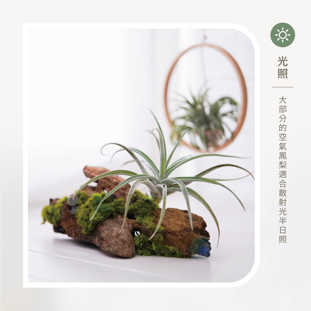 空氣鳳梨習慣穩定的氣溫環境,無法承受強烈日照。因此大部份的空氣鳳梨適合,待在散射光提供他們半日照環境為佳。