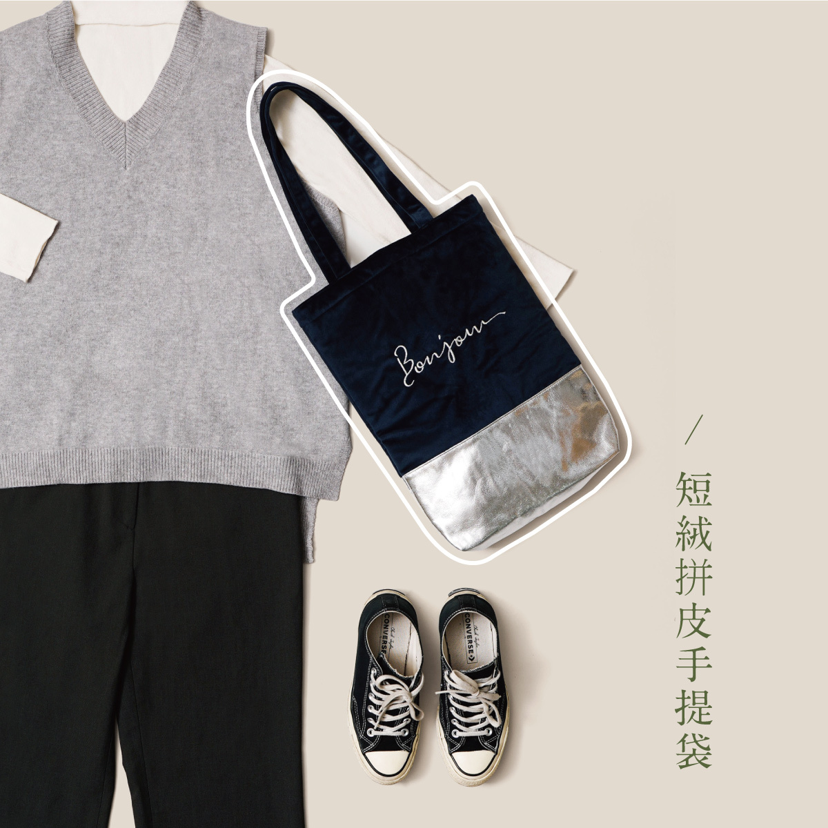 選擇深藍短絨拼銀色亮皮手提袋,