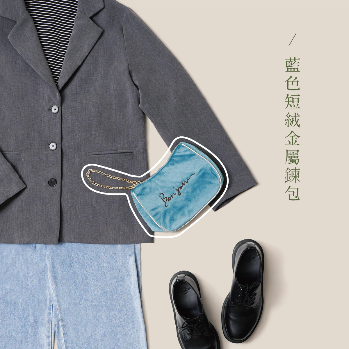 搭配鞋款黑色皮鞋,手提藍色短絨金屬鍊包