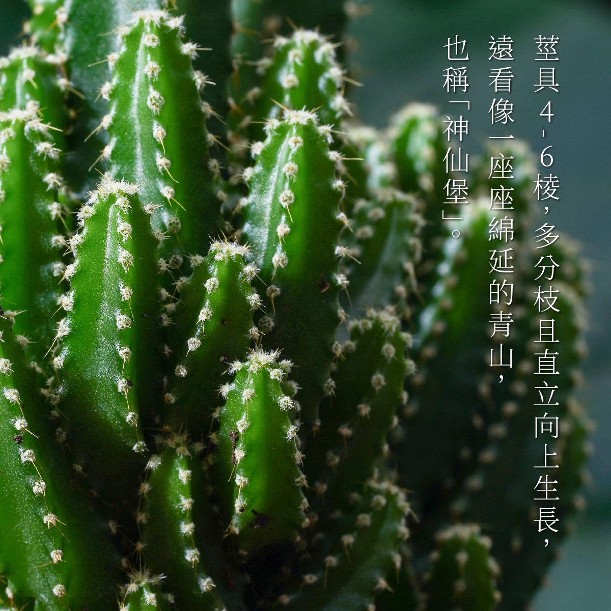 植株莖具4-6棱,多分枝且直立向上生長,遠看像一座座綿延的青山,因此得「神仙堡」美名。