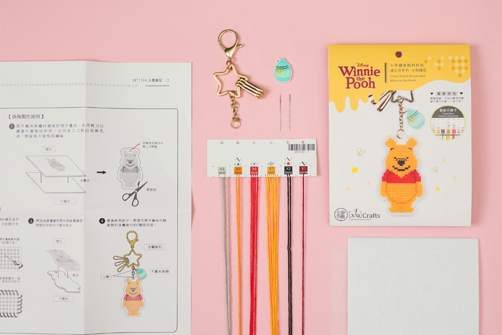 每份材料包都將所需的素材備齊,包含:繡線、繡針、網格塑片、不織布零件、蝦扣、鎖圈,以及詳細的說明書、圖稿,只要自行準備剪刀即可開始動手做!