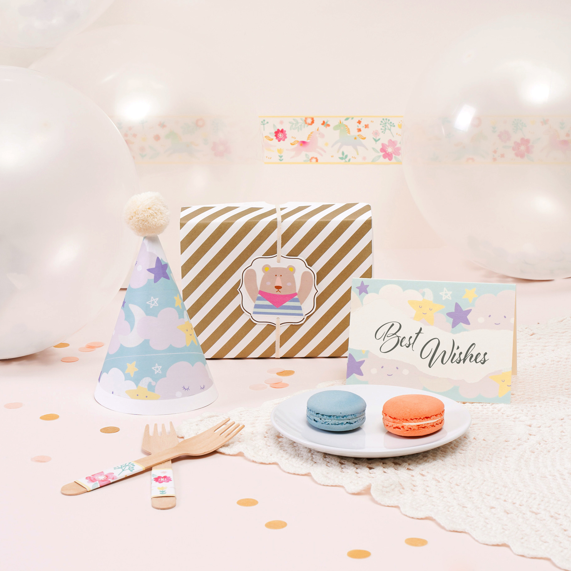 派對人人必用餐具,小小巧思就能讓派對加分,使用50W童趣紙膠帶 獨角獸花園黏一圈,超簡單就能讓餐具大變身!