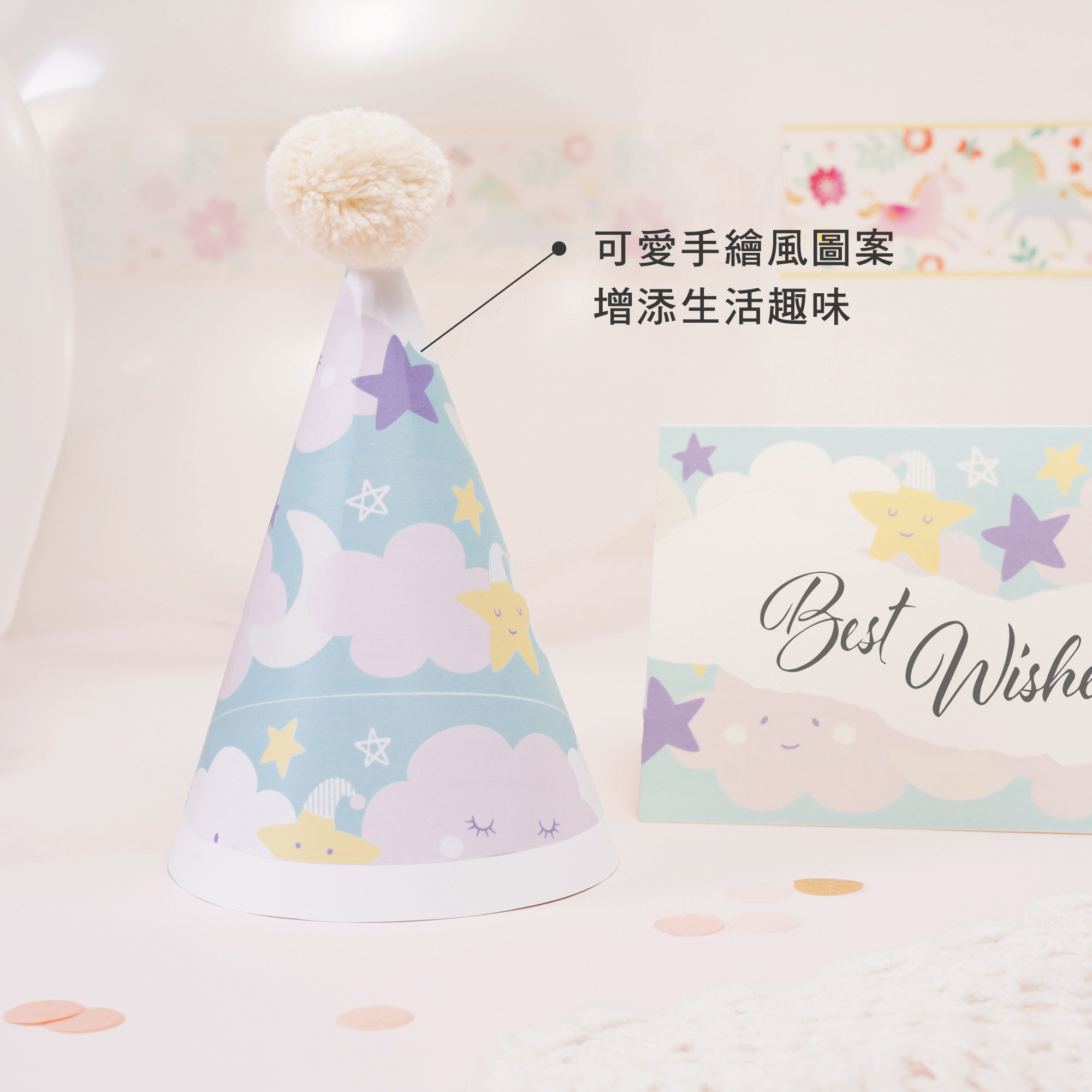 先將白色卡紙折成錐形,用雙面膠黏貼,使用50W童趣紙膠帶 寶寶雲朵繞著帽子黏一圈,重複進行繞圈直到裝飾完成!