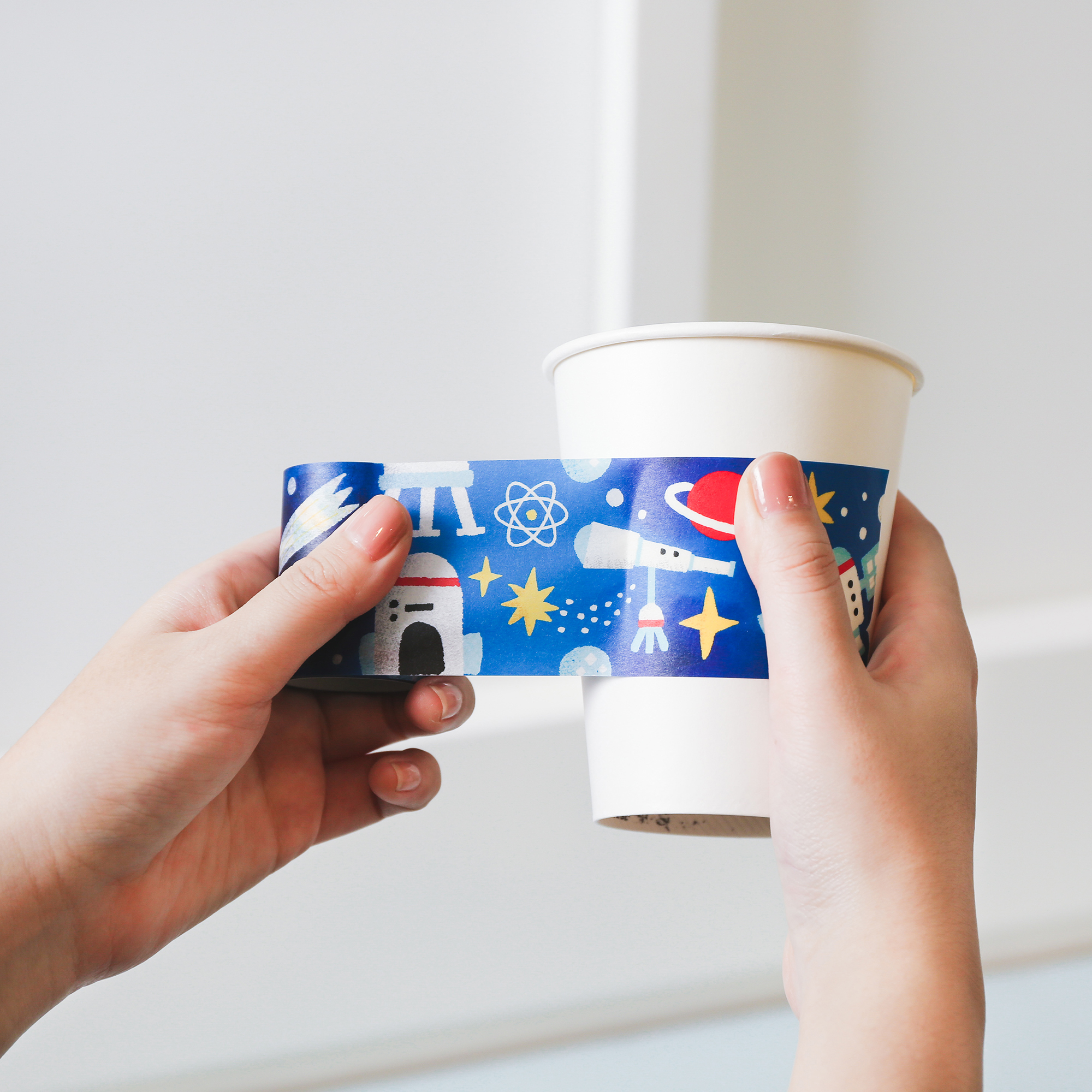 先準備要使用的紙杯,使用 50W童趣紙膠帶宇宙漫遊 繞著紙杯黏一圈,就輕鬆完成! 不僅增添派對風格,還可以用不同款來分辨客人杯子 !