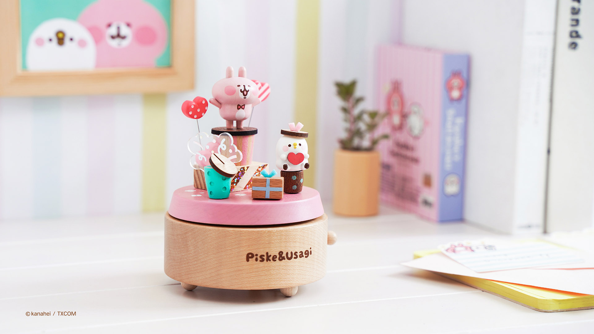 有了 P 助與粉紅兔兔,每天都值得慶祝!音樂盒底座保留原木自然紋路,轉動底部發條,開啟側邊開關,P 助與小禮物盒隨著音樂順時針旋轉,開起了繽紛熱鬧的小小派對,最誠摯的祝福包進禮物送給你!