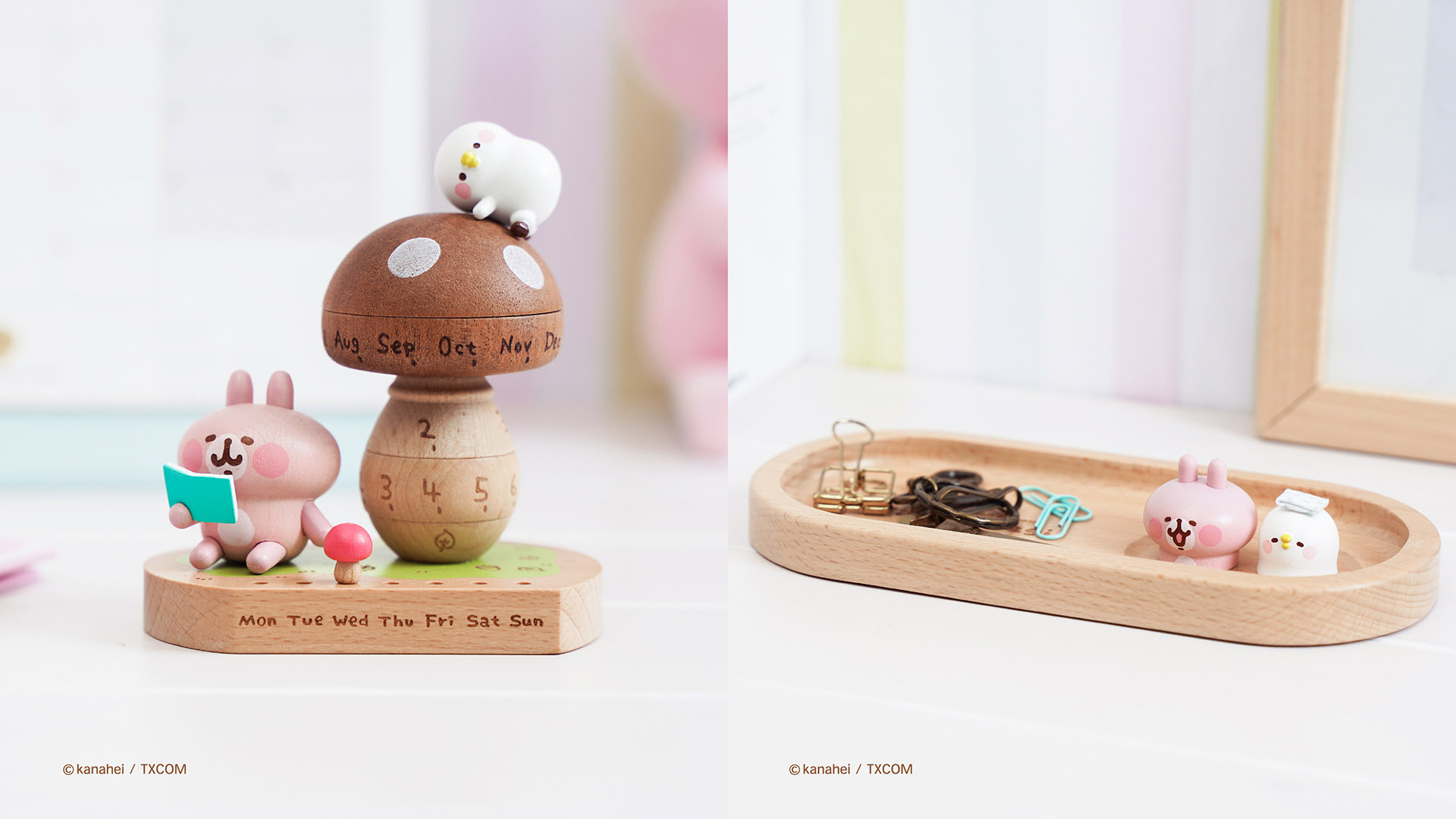 不論哪一年都能使用的萬年曆,香菇上雷射雕刻文字,每天早晨轉動日期開始新的一天。泡溫泉的粉紅兔兔收納迴紋針、長尾夾…等小物品,讓可愛的 P 助與粉紅兔兔成為專屬生活小管家!