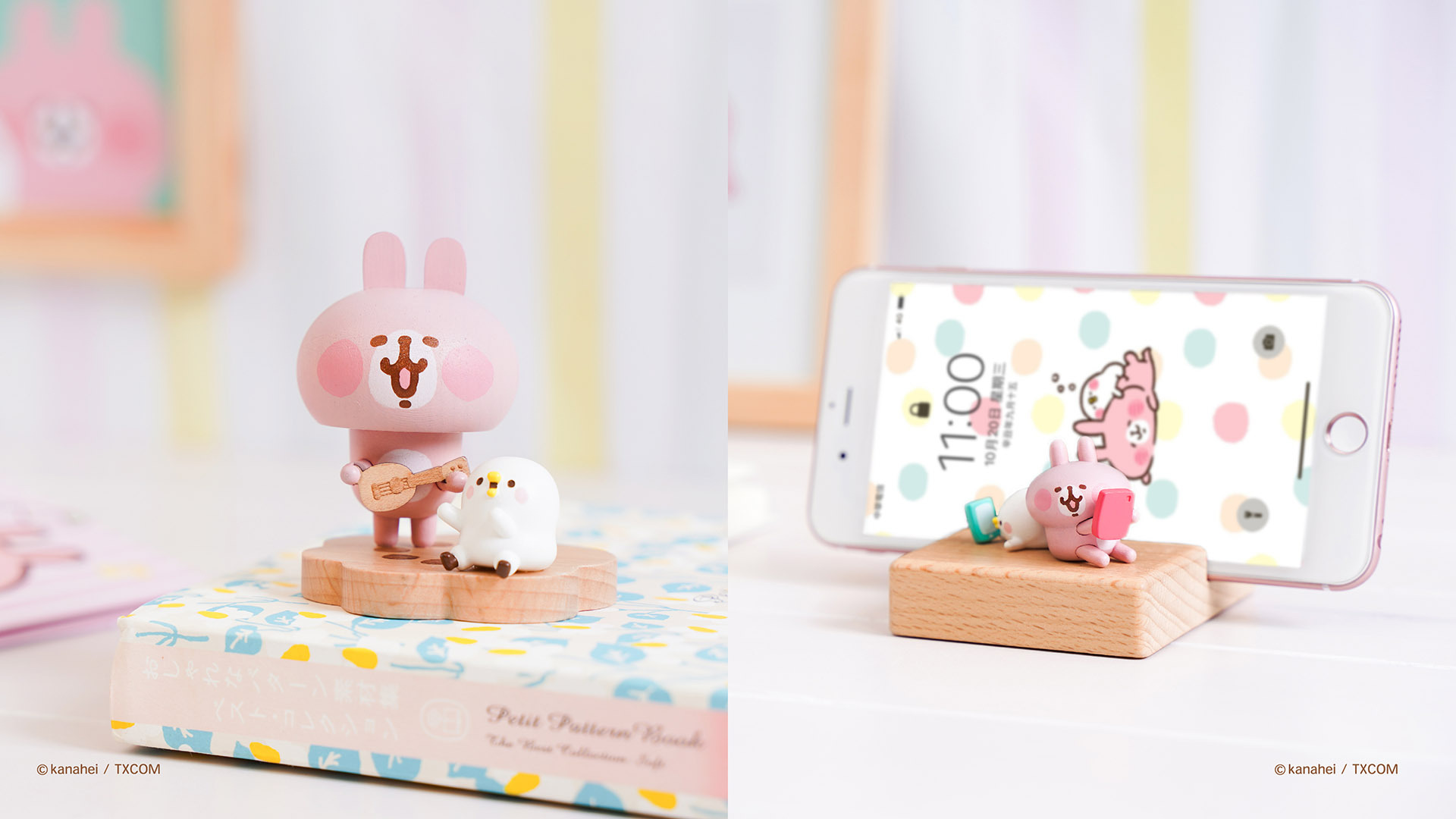 生活需要一些抒壓時刻,讓彈著吉他的粉紅兔兔與唱歌的 P 助即興演奏,輕碰粉紅兔兔的頭,還會跟著節奏一起左搖右晃擺動。手機滑累了,就放在木製手機座上,讓同樣在滑手機的粉紅兔兔幫你 HOLD 住,放鬆一下!