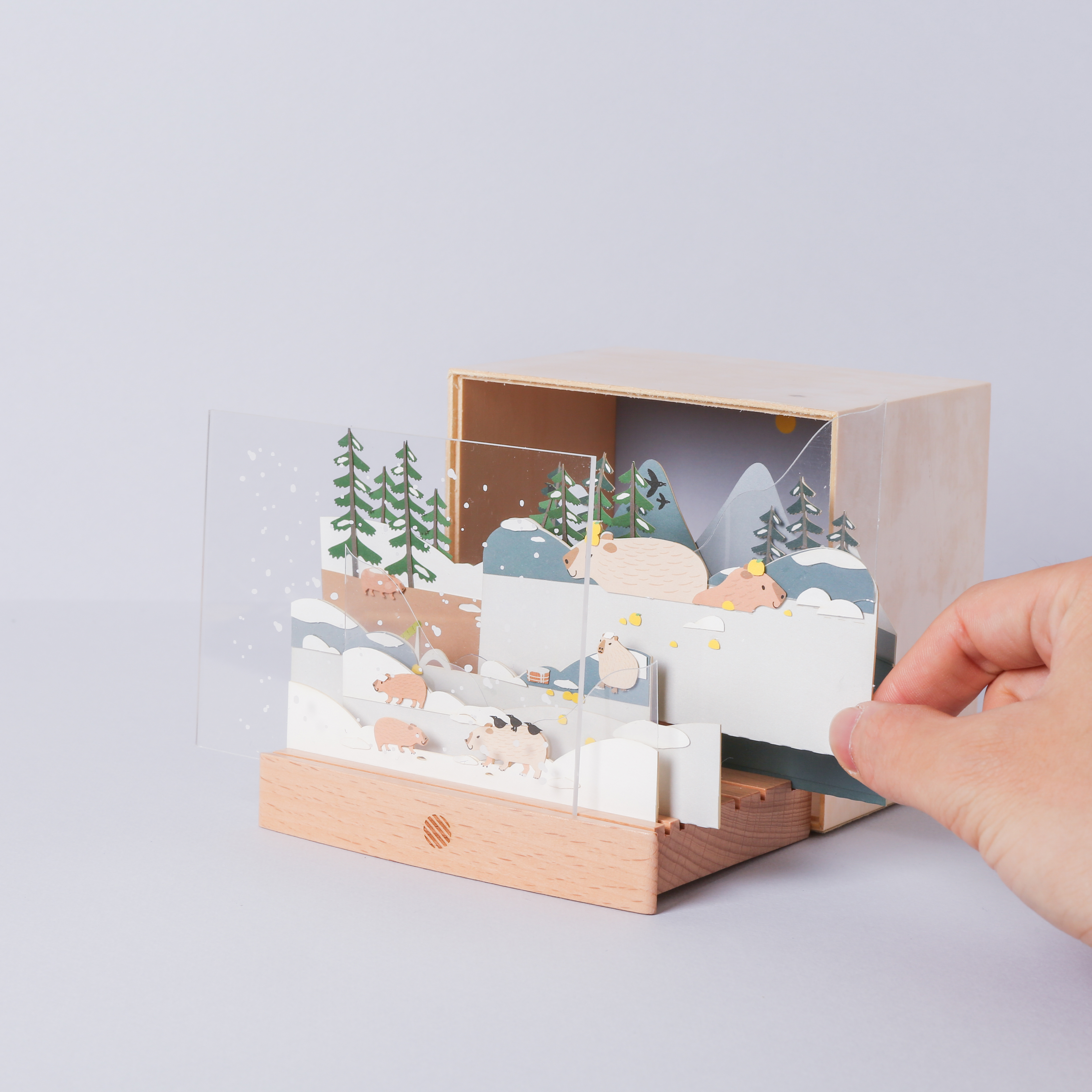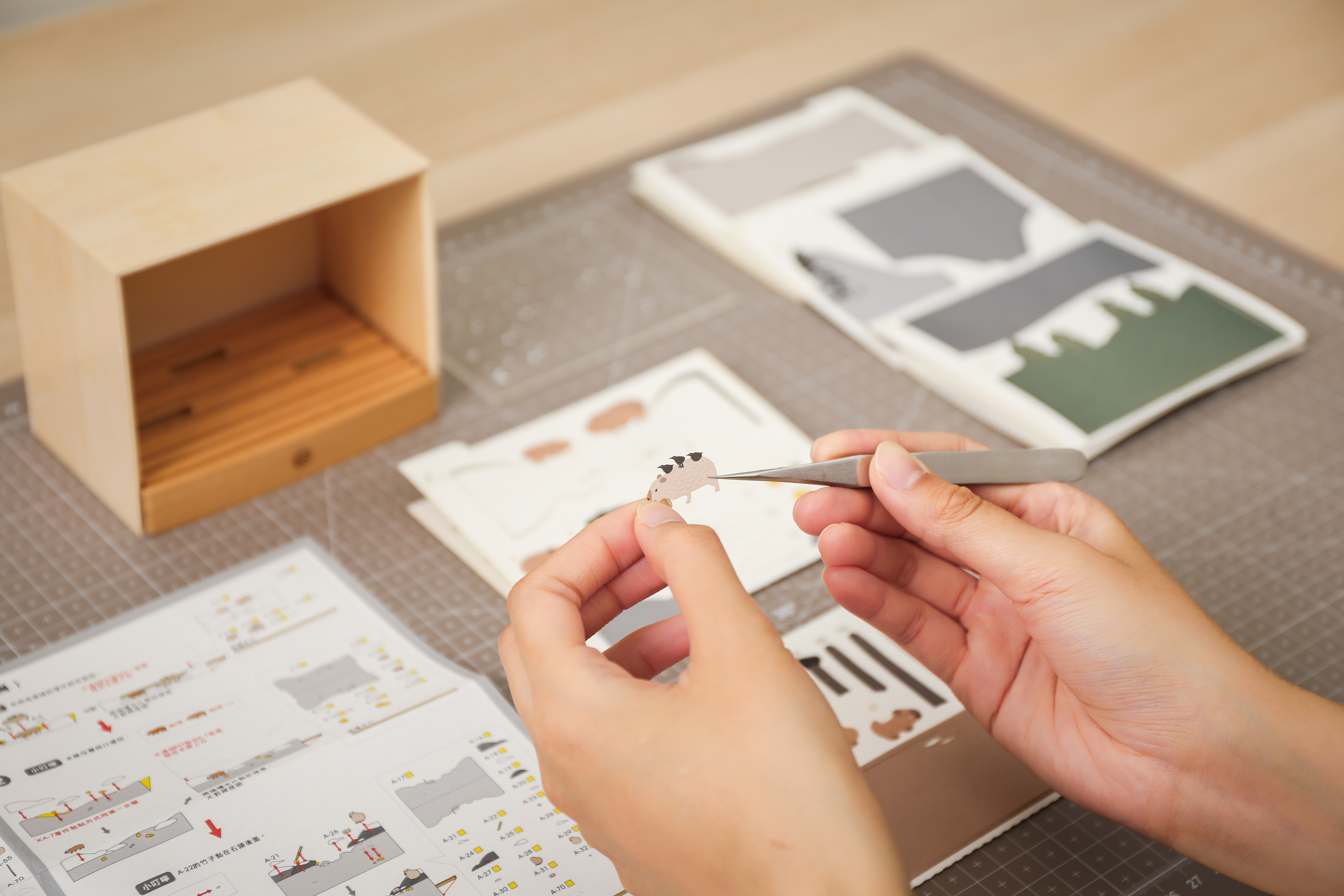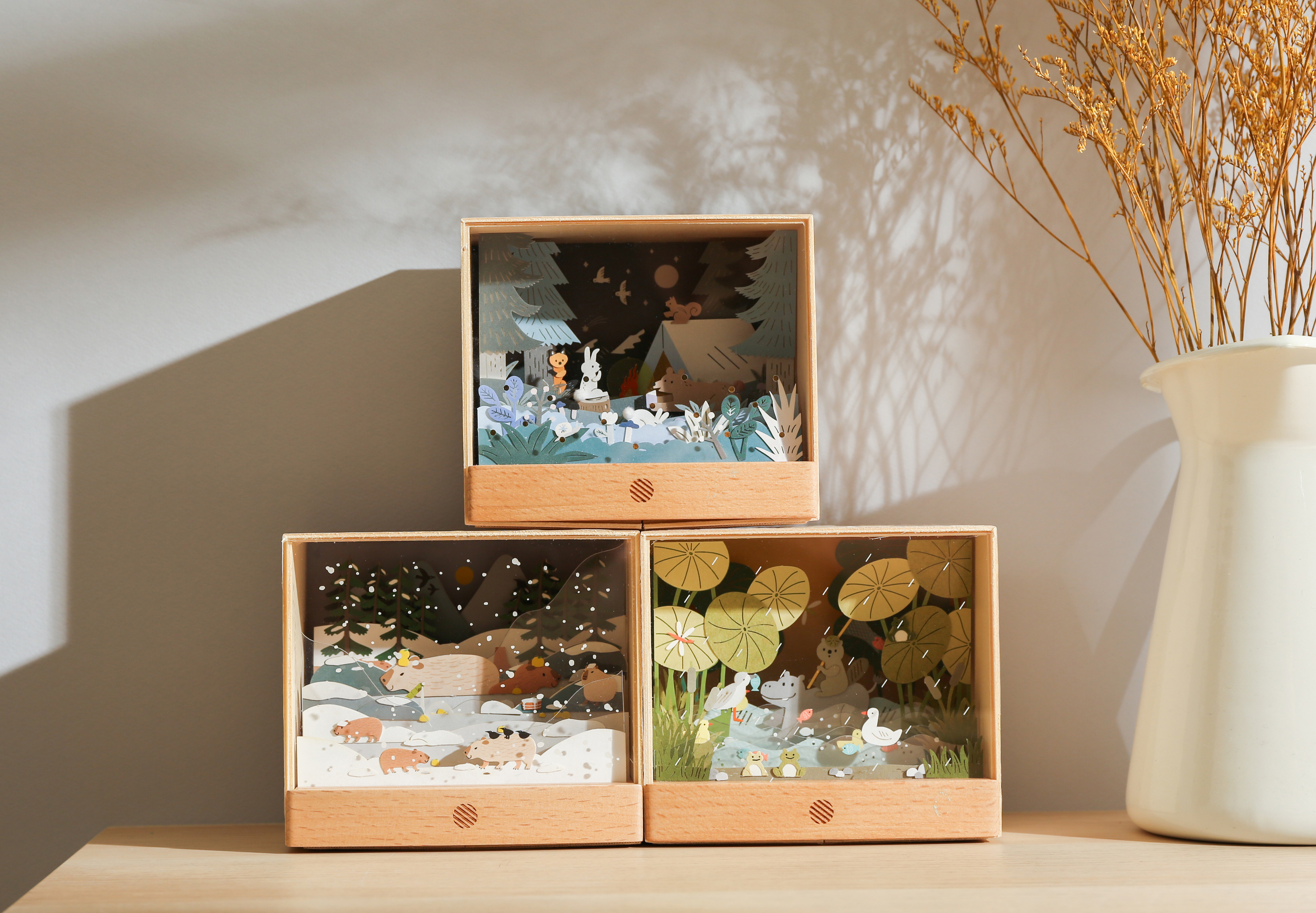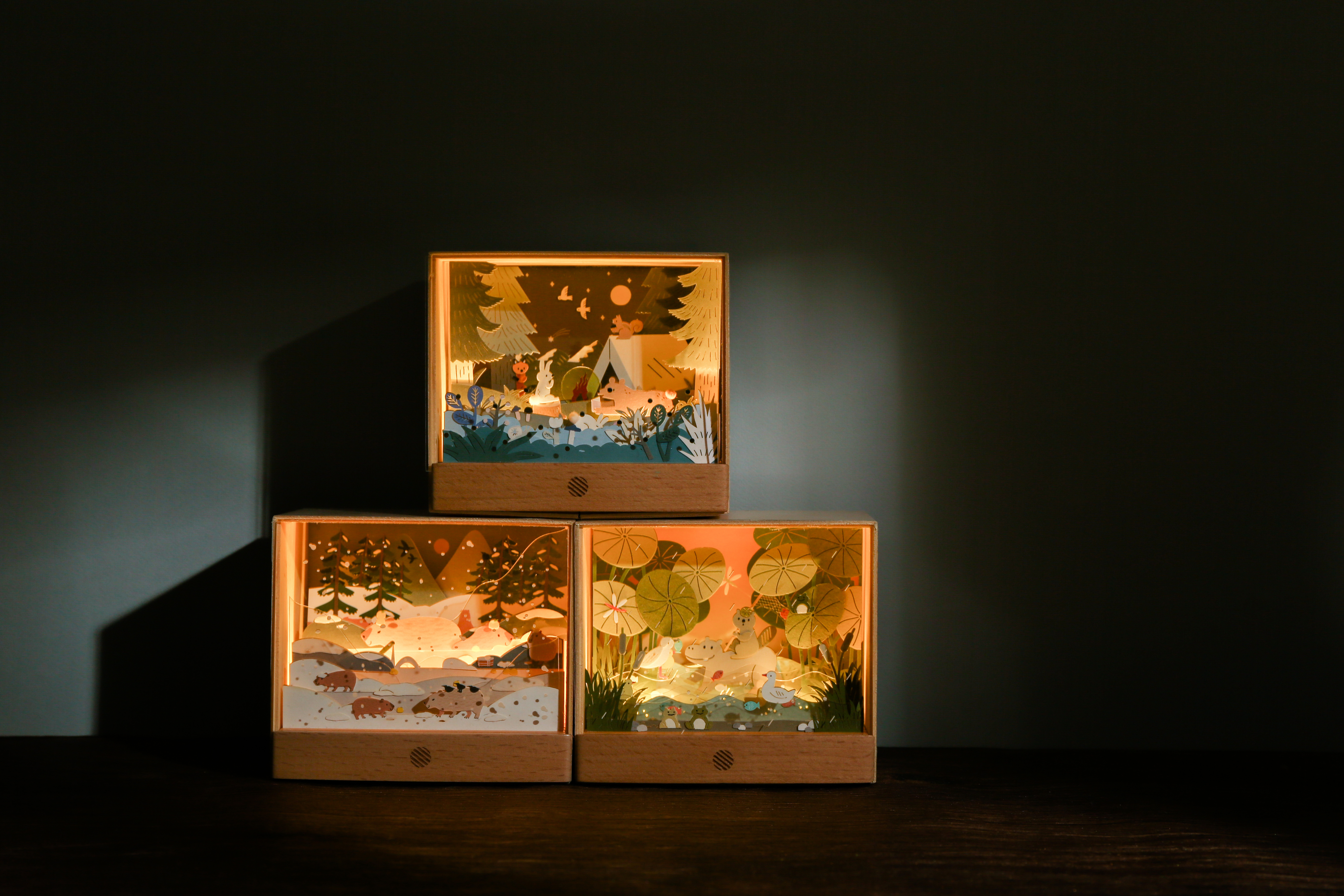 紙風景動物故事燈DIY組,在微光中悄悄展開故事序幕。小小的發光窗景內有著,細膩的設計刻劃出森林中的小動物以及豐富的故事素材。