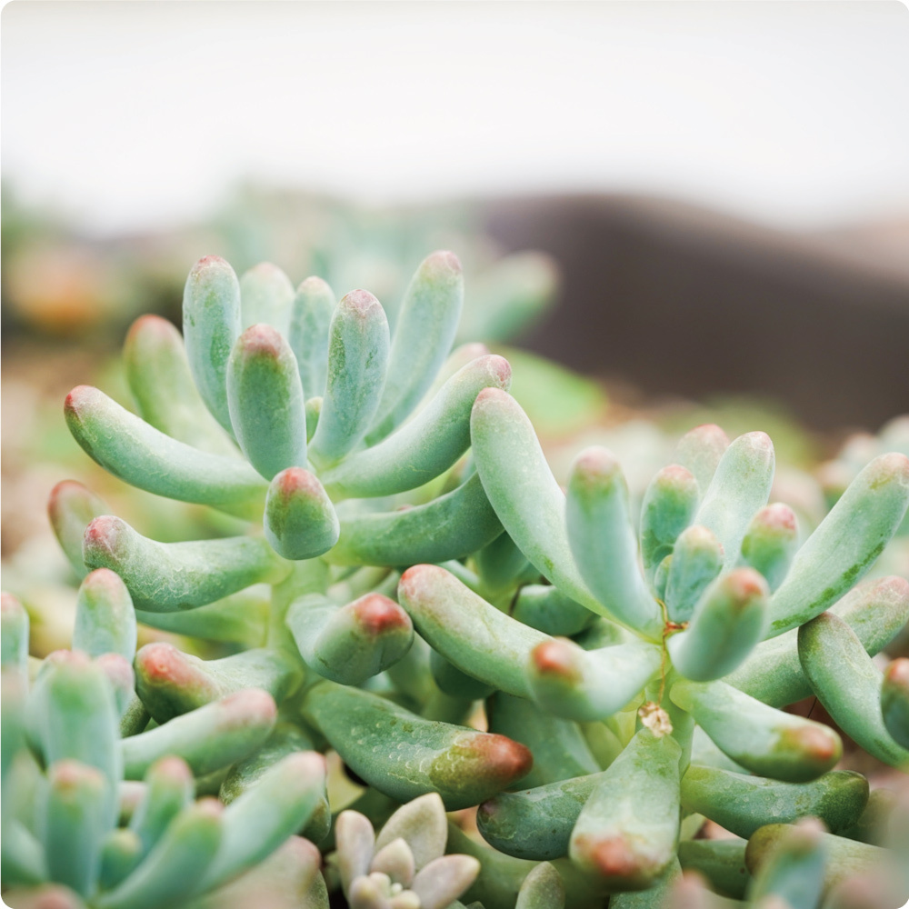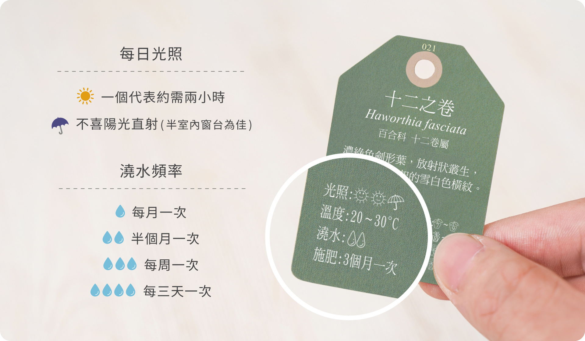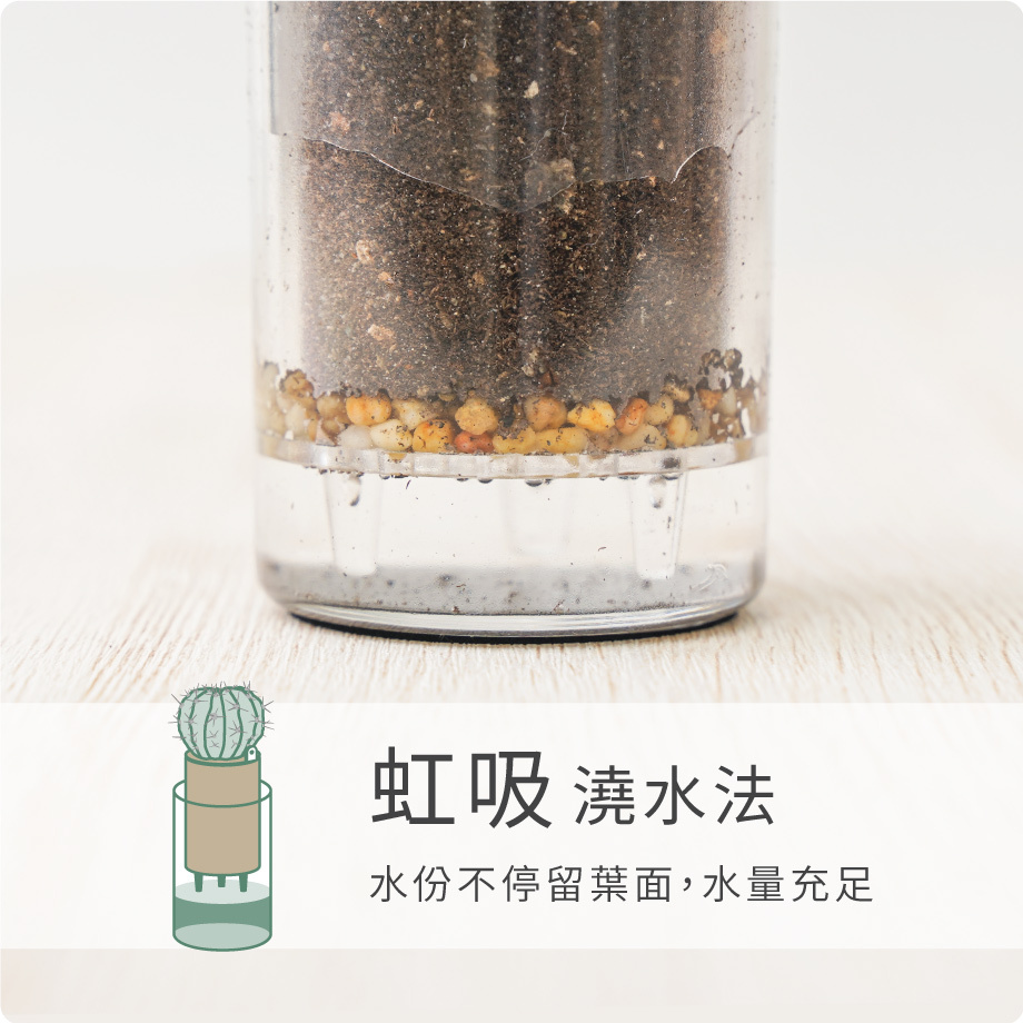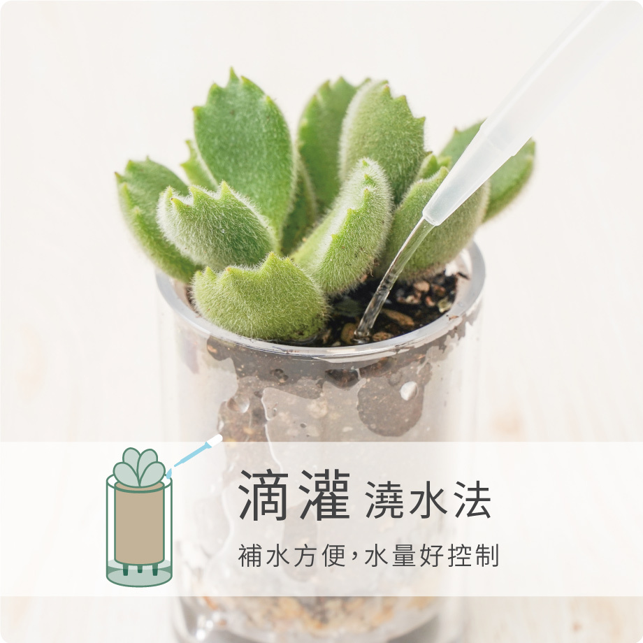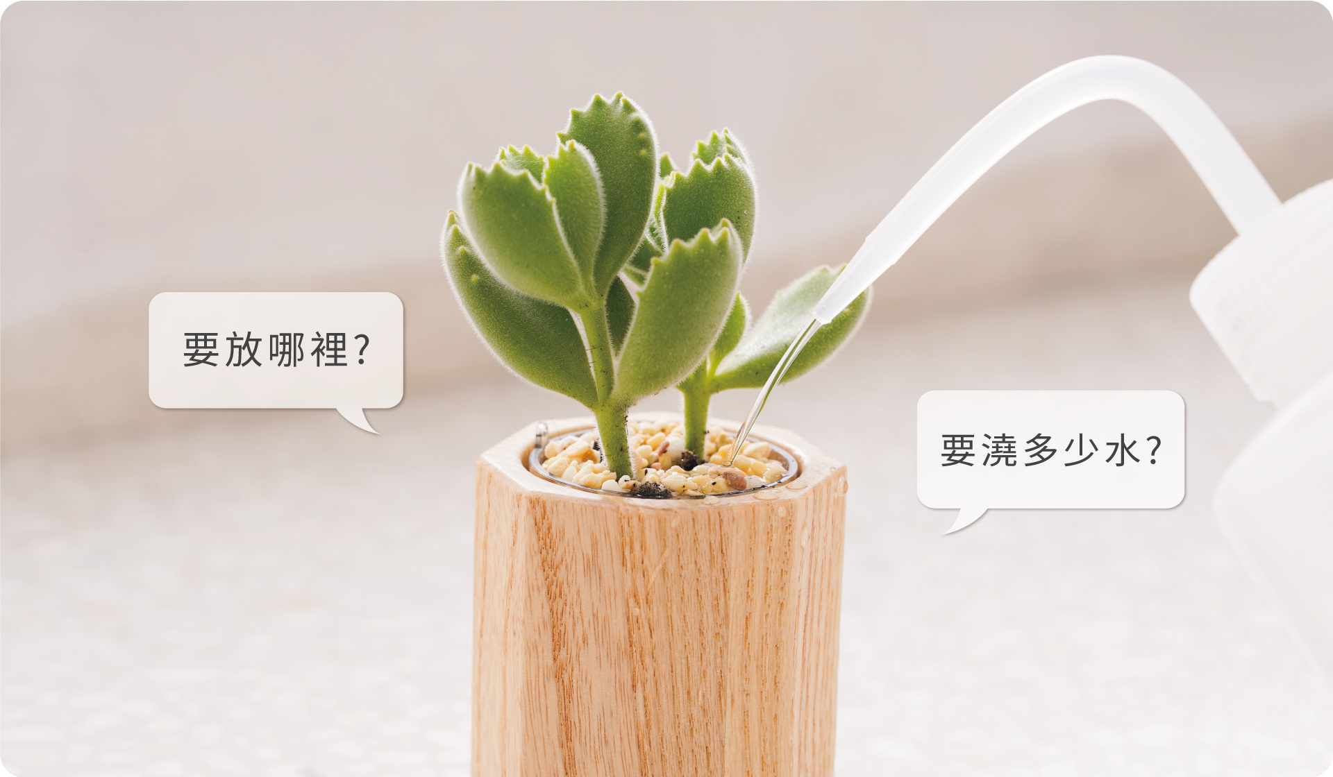 我們的植物會搭配專利設計的植栽罐,更方便澆水,請參照照顧小卡指示的水量給水,同時觀察多肉狀況,土乾時再給水,記得要配合季節調整喔!